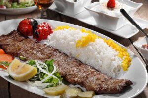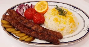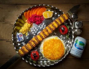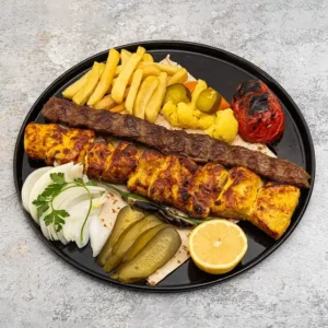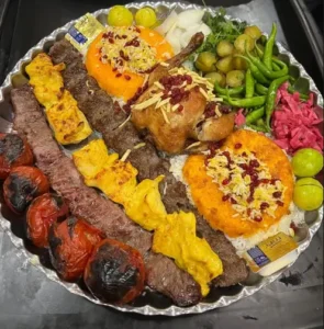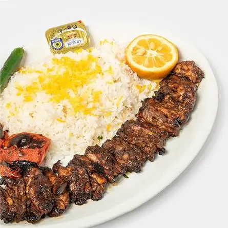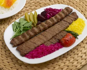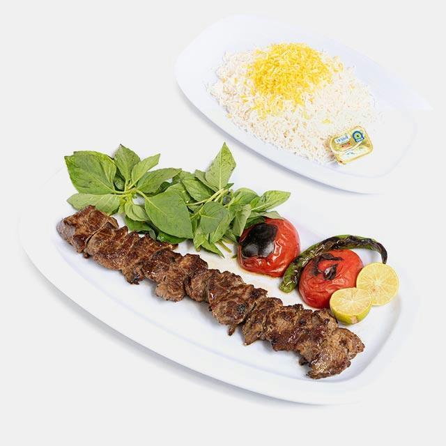 یک سیخ کوبیده 120گرم + یک سیخ جوجه 300گرم + برنج طارم محلی 320گرم + دورچین + کره