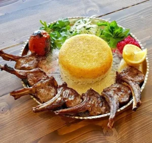 راسته گوساله 220گرم + یک سیخ کوبیده + برنج طارمی محلی 320گرم + دورچین + کره