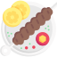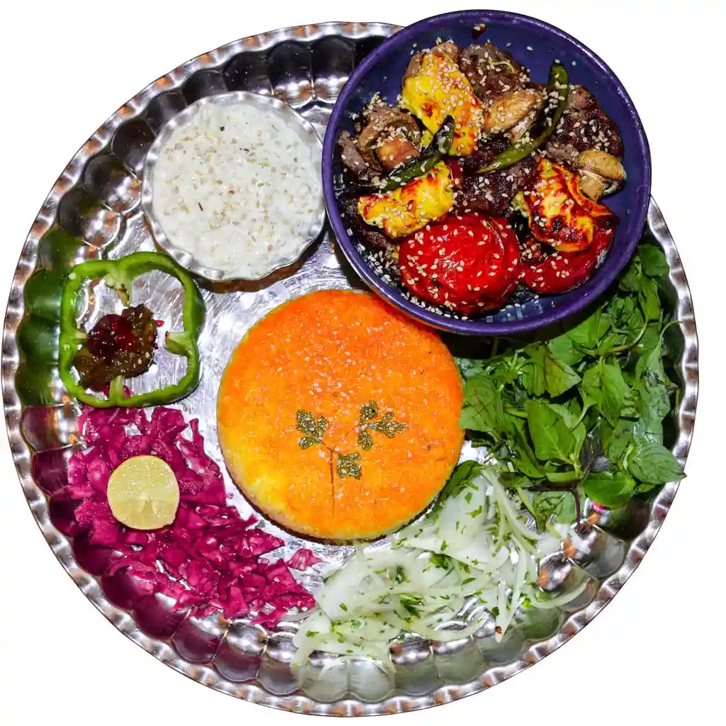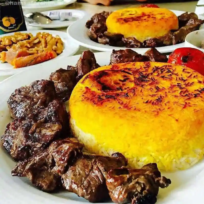 یک سیخ کوبیده 120گرم + جوجه 150گرم + فیله گوساله 150گرم + برنج طارم محلی 320گرم + فلفل کبابی + کره محلی + کنجد + قارچ + دورچین